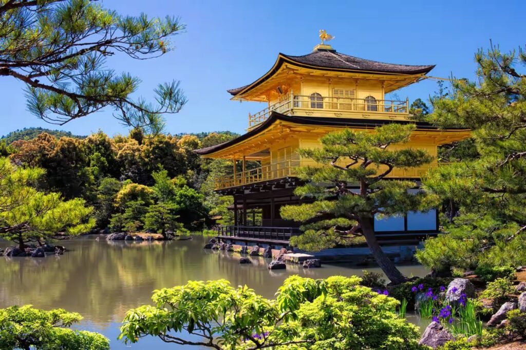 Conhecido formalmente como Rokuon-ji, o Kinkaku-ji, ou Pavilhão Dourado, é um espetáculo para ser visto. Originalmente a villa do shogun Ashikaga Yoshimitsu, este templo budista está coberto em folha de ouro, refletindo seu brilho sobre o espelho d’água circundante, o que lhe rendeu reconhecimento mundial. A paisagem circundante, um jardim cuidadosamente desenhado que embeleza ainda mais o templo, é um exemplo perfeito de beleza natural harmonizando com a arquitetura humana.